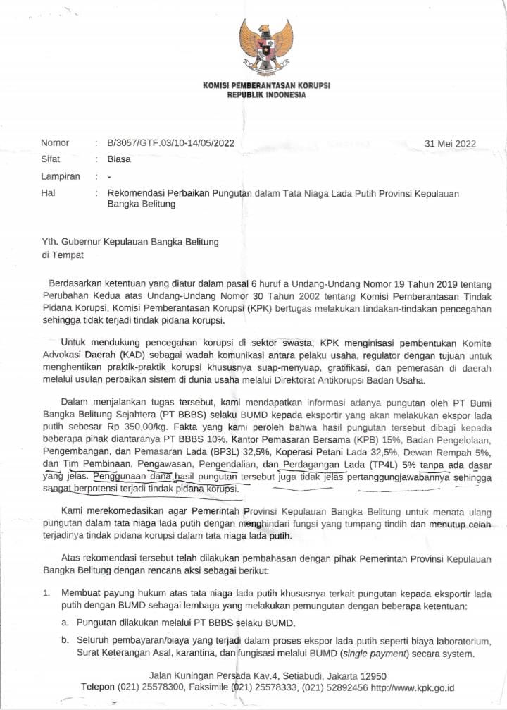 Salah satu pejabat KPK yang enggan disebut namanya menegaskan, “Kami melihat ada celah penyalahgunaan kewenangan dalam tata niaga lada putih ini. Pembagian hasil pungutan yang tidak jelas akuntabilitasnya bisa menjerumuskan pihak-pihak terkait ke ranah pidana.”
