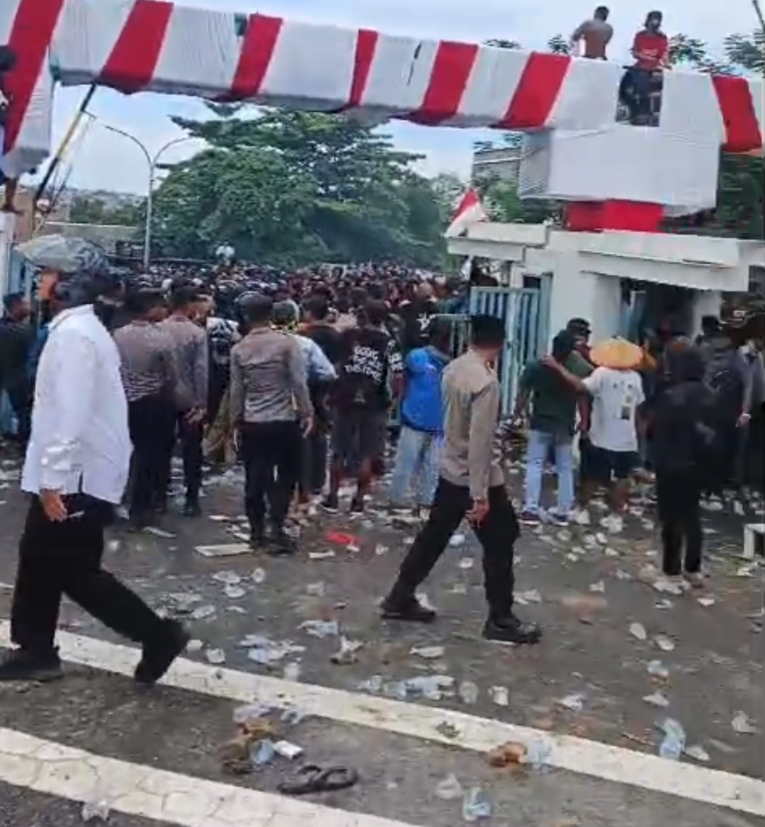 BABELTERKINI.COM, PANGKALPINANG -Aksi unjuk rasa rakyat penambang di depan kantor PT. Timah diwarnai kericuhan. Kejadian ini berawal dari lemparan kemasan air mineral ke petugas kepolisian yang berjaga.