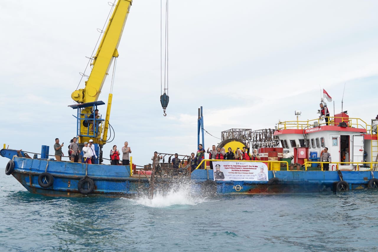 BABELTERKINI.COM, BANGKA – Direktorat Lalu Lintas Polda Bangka Belitung melepaskan karang buatan atau rumpon bagi ikan diperairan Rebo, Sungaliat Kabupaten Bangka, Kamis (6/11/25).